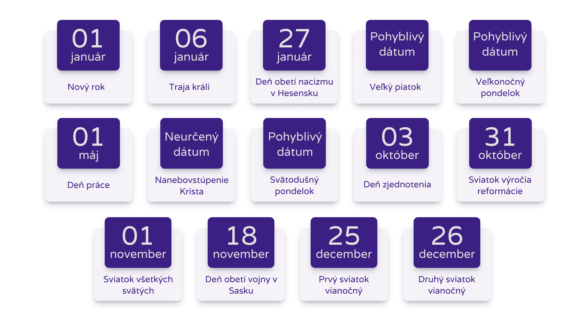 Štátne sviatky sú v Nemecku považované za dni voľna a oddychu pre všetkých občanov, spájajú sa s nimi preto aj zatvorené obchody. Pravidlo platí pre väčšinu prevádzok vrátane maloobchodov a nákupných centier, medzi výnimkami nájdeme predajne na letiskách, železničných staniciach či v turistických oblastiach. Zabúdať netreba na to, že pravidlá a obmedzenia otváracích hodín počas štátnych sviatkov sa v jednotlivých nemeckých spolkových štátoch môžu líšiť.